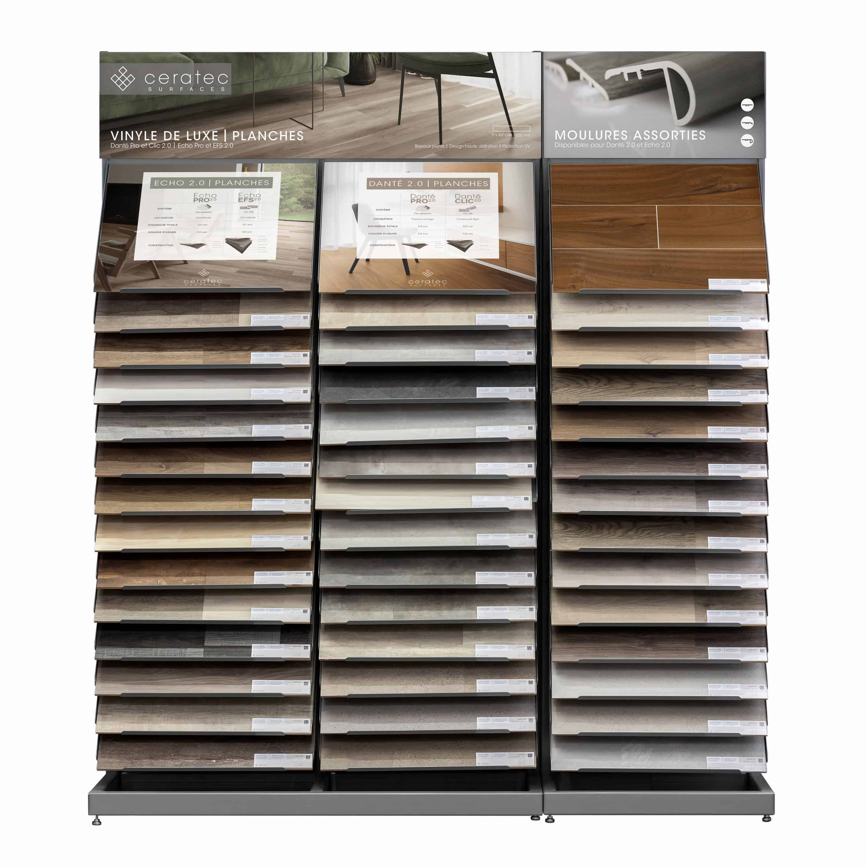 Les ensembles de présentoirs ELEMENTO sont la solution parfaite pour mettre en valeur les échantillons de la nouvelle collection de vinyle de luxe LVT 2.0. Les ensembles ont été pensés pour présenter les programmes de produits de format tuile (LVT) et format planche (LVP) sur deux présentoirs distincts. L'option de présenter l'offre de produits Danté 2.0 en format planche sur un présentoir simple ELEMENTO est aussi disponible.