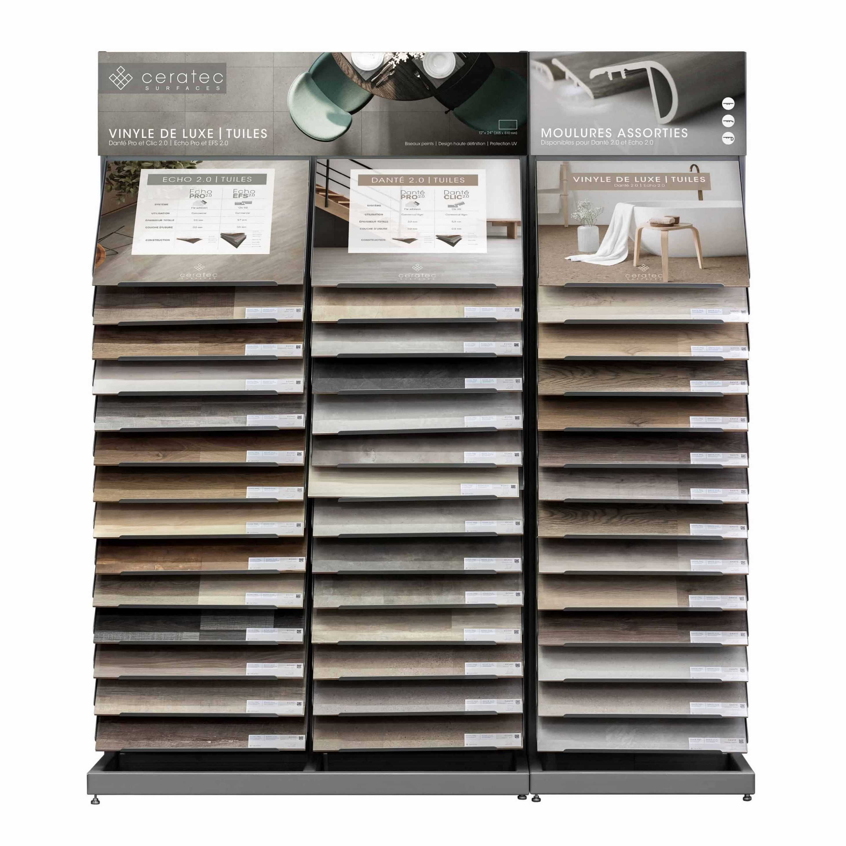 Les ensembles de présentoirs ELEMENTO sont la solution parfaite pour mettre en valeur les échantillons de la nouvelle collection de vinyle de luxe LVT 2.0. Les ensembles ont été pensés pour présenter les programmes de produits de format tuile (LVT) et format planche (LVP) sur deux présentoirs distincts. L'option de présenter l'offre de produits Danté 2.0 en format planche sur un présentoir simple ELEMENTO est aussi disponible.
