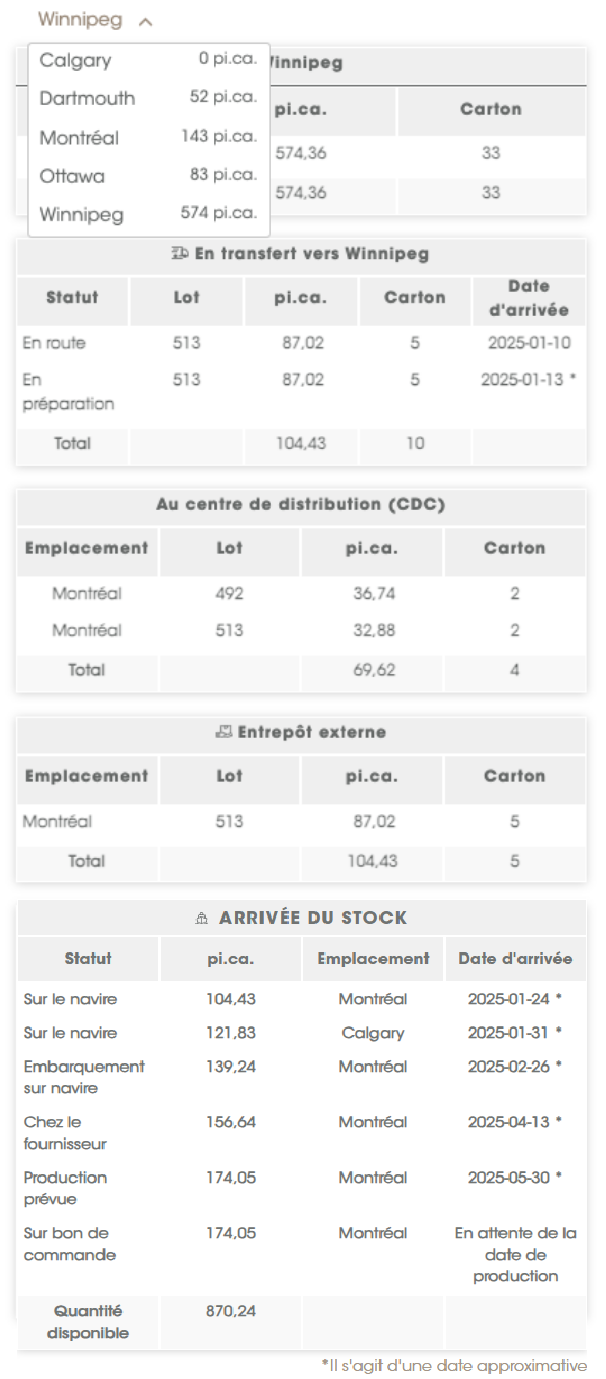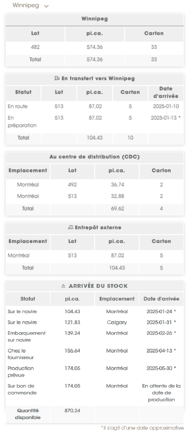 Le tableau d'inventaire indique la disponibilité des produits par numéro de lot dans nos entrepôts (centres de distribution et succursales locales) et notre chaîne d'approvisionnement. Si un produit est en transit, la date d'arrivée estimée sera affichée.